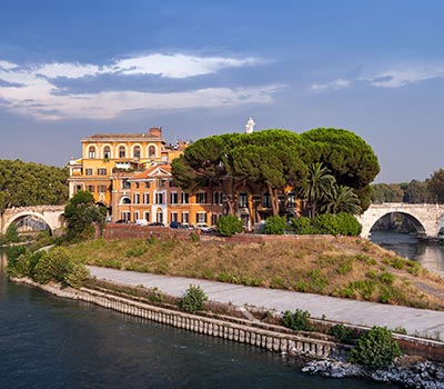 Tiber Island” develops over an area of 270 x 70 meters and was apparently formed, so legend has it, as a result of hay stacks from Campo Marzio being thrown into the shallow waters. It was chosen as the site for the foreign cult of Aesculapius (the god of Medicine symbolised by a serpent) introduced to Rome from Greece following the pestilence of 292 BC. It was thus entirely consecrated to that god to the point of also being dubbed Aesculapius’ Island, because of this, it soon acquired a hospital function still true today with the presence of the Fatebenefratelli Hospital.